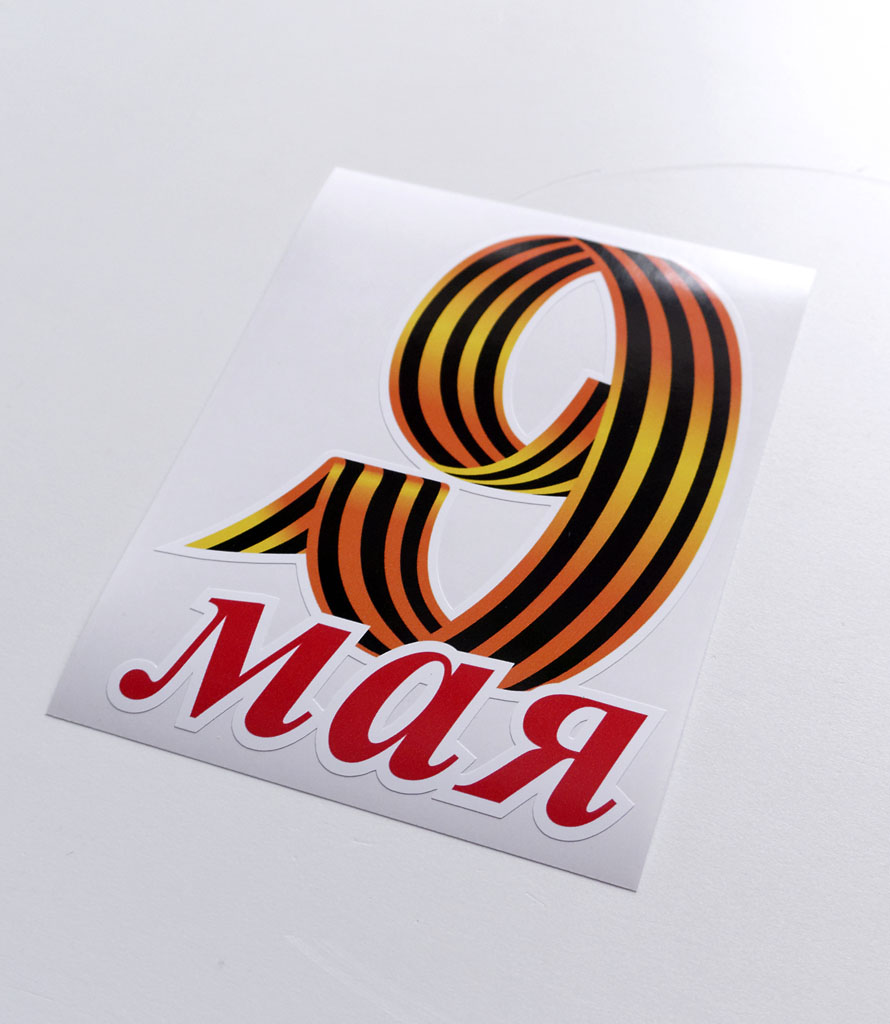 Наклейка на авто "9 мая" в категории "Наклейки на автомобиль" - яркая самоклеящаяся наклейка из виниловой плёнки с водостойким изображением из 16 миллионов цветов. Наклейка полностью готова к нанесению, живые и насыщенные цвета этой наклейки обеспечиваются применением японских чернил на основе растворителя с печатью изображения на цифровых плоттерах гранд-формата от лидеров индустрии. Стикер-наклейка может иметь любую форму - вырубка по контуру выполняется на станке с программным управлением. Все операции по изготовлению наклейки выполняются нами на собственном производстве, удобно расположенном в центре России для минимизации затрат и гарантии конкурентоспособной цены.